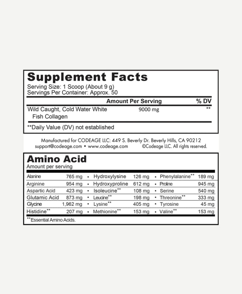 Theo thông tin từ nhà sản xuất, mỗi muỗng bột Collagen Cod Aage Wild-Caught Marine Collagen Peptides mang tới hơn 9.000mg collagen. Chúng bao gồm cụ thể các loại amino acids như sau: