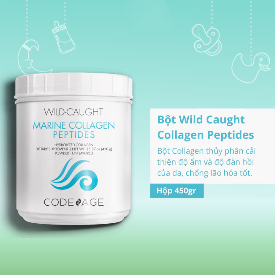 Là sản phẩm nổi tiếng đến từ thương hiệu Code Age, Mỹ. Bột Collagen từ cá Wild Caught Marine Collagen Peptides là sản phẩm được nghiên cứu và phát triển bởi đội ngũ chuyên gia hàng đầu. Bằng việc sử dụng nguồn nguyên liệu sạch từ da và vảy cá trắng được đánh bắt tự nhiên ở vùng biển lạnh Bắc Mỹ, sản phẩm mang lại hệ dưỡng chất đột phá với sự có mặt của 18 loại amino acids thiết yếu giúp sản sinh Collagen tự nhiên cho da.