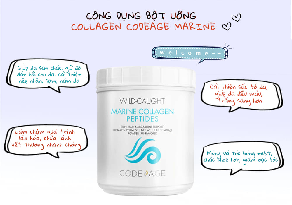 Đây sẽ là nguồn bổ sung, tổng hợp Collagen lý tưởng, giúp làn da được trẻ hóa và ngăn chặn các nguy cơ về lão hóa một cách triệt để. Sử dụng dòng bột uống Collagen nhà Code Age còn là cách để bạn chăm sóc vẻ đẹp của da, tóc, móng cũng như sức khỏe của răng, xương.