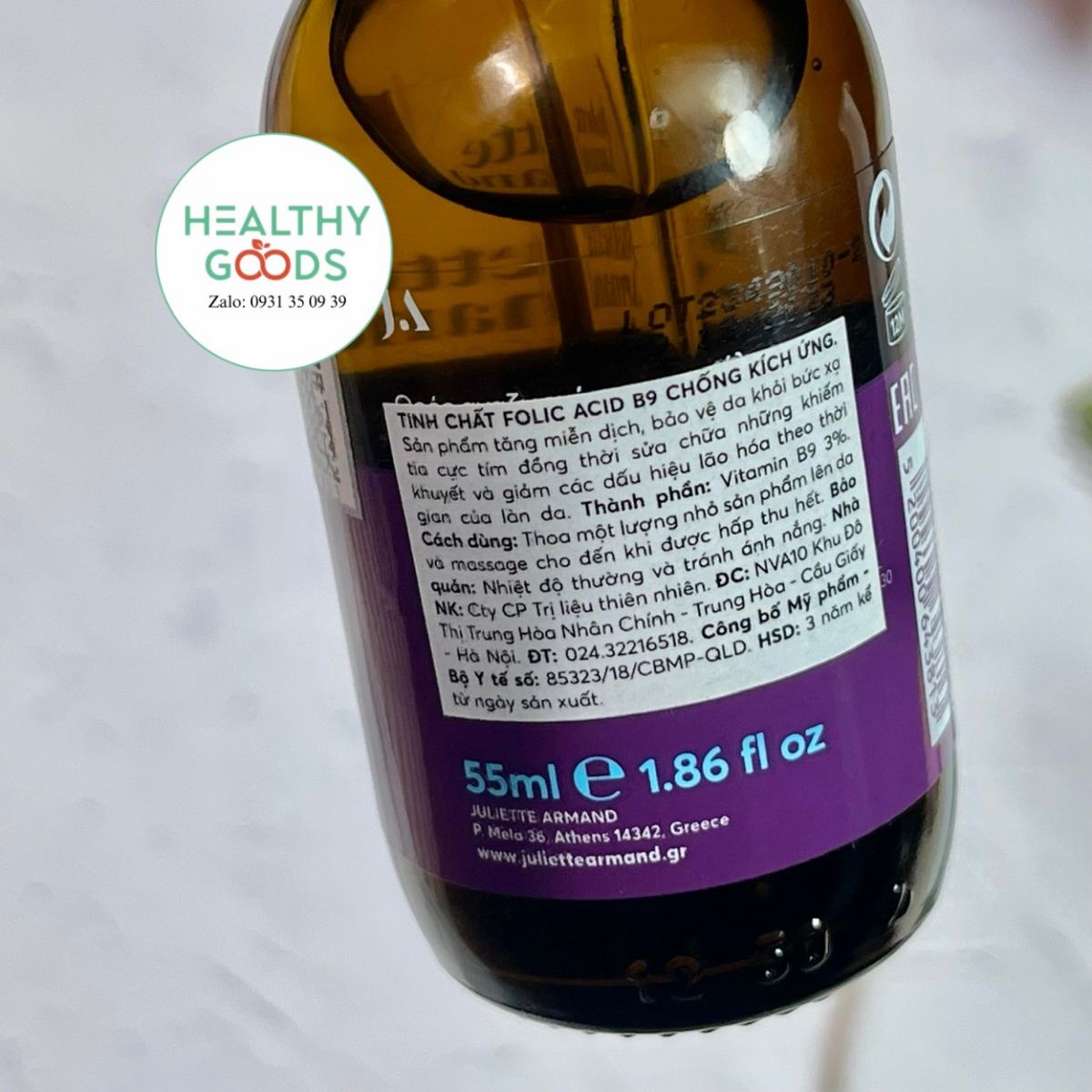Serum Elements Folic Acid B9 là dòng sản phẩm được chứng nhận về độ an toàn và lành tính khi sử dụng với mọi làn da. Không chỉ vậy, với những đột phá về thành phần hoạt chất, đặc biệt là sự xuất hiện của Vitamin B9 (Axit folic) được xem là hoạt chất vàng trong điều trị kích ứng cho làn da. Serum B9 Juliette Armand thúc đẩy nhanh chóng quá trình trao đổi protein trong da. Từ đó giúp làn da được hồi phục nhanh mà không để lại seo.